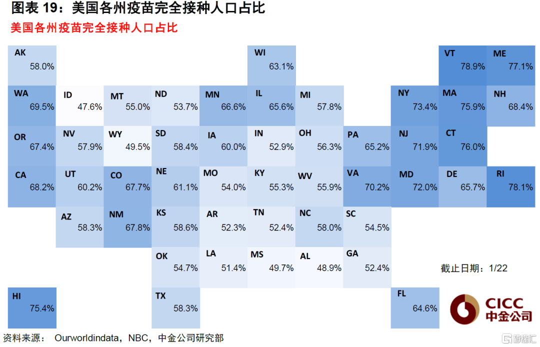 我们预计,若本轮疫情能够在春季降温,对全球未来抗疫演变将带来较大影响。虽然以目前的研究和现实情况看,新冠病毒还未能被完全消灭,但免疫基数高+治疗能力强的国家将更快走出疫情对民生和经济的阴影,其中免疫基数取决于疫苗接种比例(以及加强针接种)和痊愈患者的占比,治疗能力强则取决于医疗资源及特效药的可获得性。这两者将使得确诊与重症患者数量的进一步脱钩,弱化疫情的影响。具体来看,