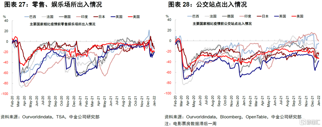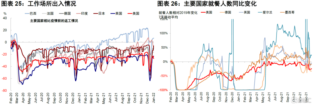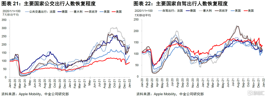 欧美疫情筑顶有助于边际缓解本就紧张的商品和就业的供给压力。由于本轮疫情爆发速度快且峰值高,对供给和需求尤其是线下部分都造成了较大的影响,造成了美国12月非农和零售数据的双双不及预期,1月的情况从线下高频数据例如出行和娱乐就餐等也可以看到疫情的扰动。因此,疫情筑顶在短期内无论是就业、线下需求、以及供应链可能都是一个好消息。