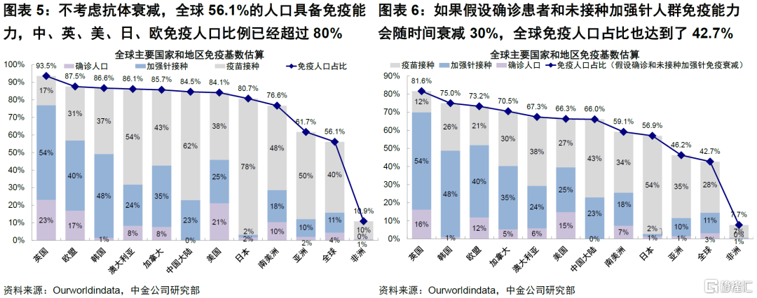 1)免疫基数:全球免疫人口占比已经过半,多国超过80%;全球免疫基数达到较高水平。Omicron变种传播速度高,在多国例如加拿大和欧盟国家近两个月的感染总数接近疫情爆发至今的一半,叠加疫苗接种比例,全球将达到一个较高的免疫基数水平。我们以确诊+疫苗接种作为具有免疫能力的人群计算占比,在不考虑抗体衰减的情况下,全球已经有56.1%的人口具备免疫能力,除了亚洲和非洲等地区,中、英、美、日、欧免疫人口比例已经超过80%。