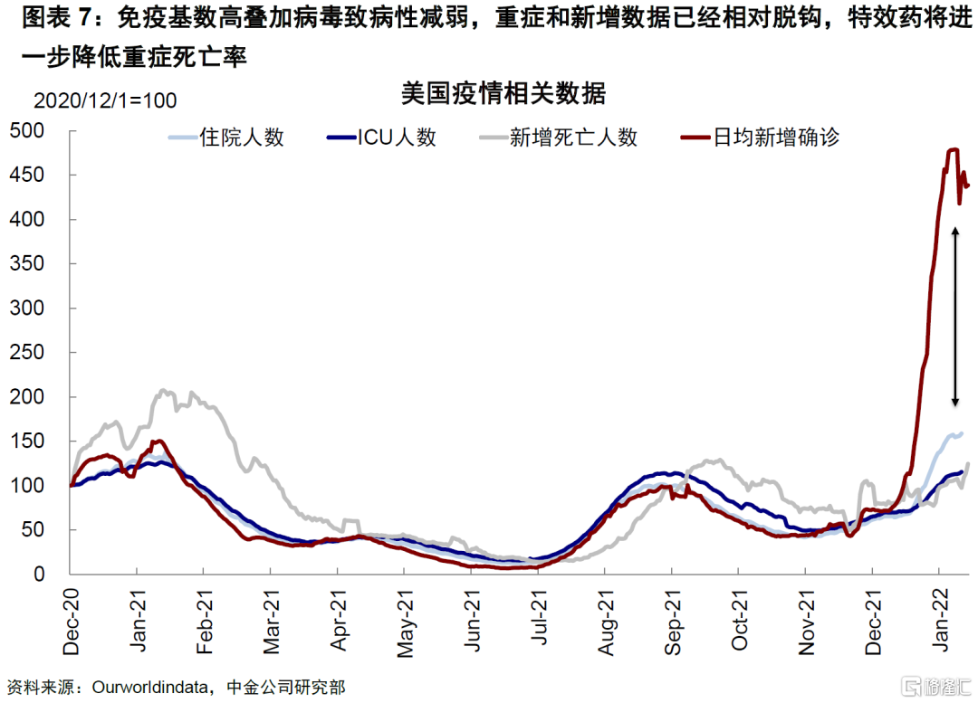 此外,虽然在本轮疫情由于新增确诊的绝对规模过高,以美国为例医疗系统资源仍受到一定影响(《疫情再创记录,但负面影响或难持续》),但展望未来,特效药的量产和大规模使用将进一步降低重症和死亡率,成为降低医疗系统压力的突破性拐点。重症和确诊数量脱钩将弱化疫情对经济的影响。