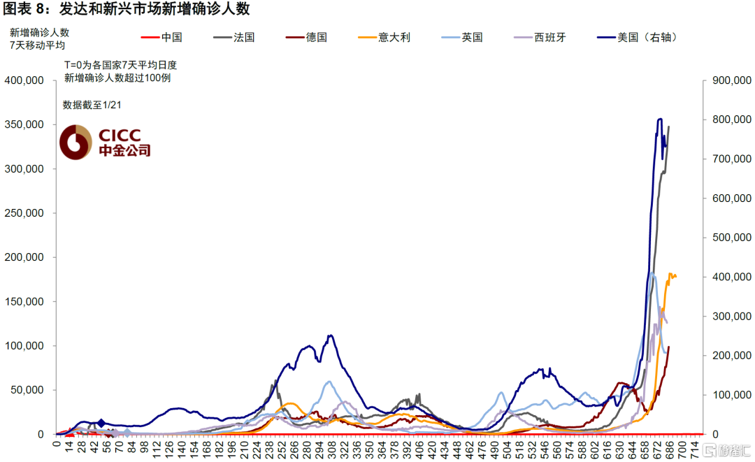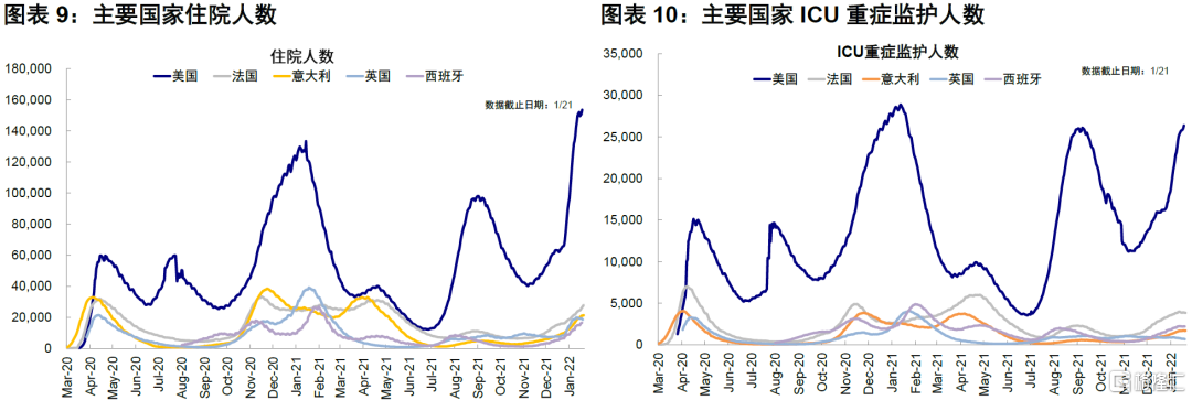 本周美国、西班牙、意大利新增确诊见顶回落。本周美国日均新增确诊73.4万人(上周80.1万人)见顶回落,但由于重症和死亡指标相对时间滞后,当前美国住院人数筑顶,但ICU和死亡人数仍在上升。英国持续回落,西班牙小幅回落,意大利新增确诊同样相对筑顶,但德国和法国仍在持续上升。整体看欧美等发达国家可能在下周或2月初迎来疫情拐点。