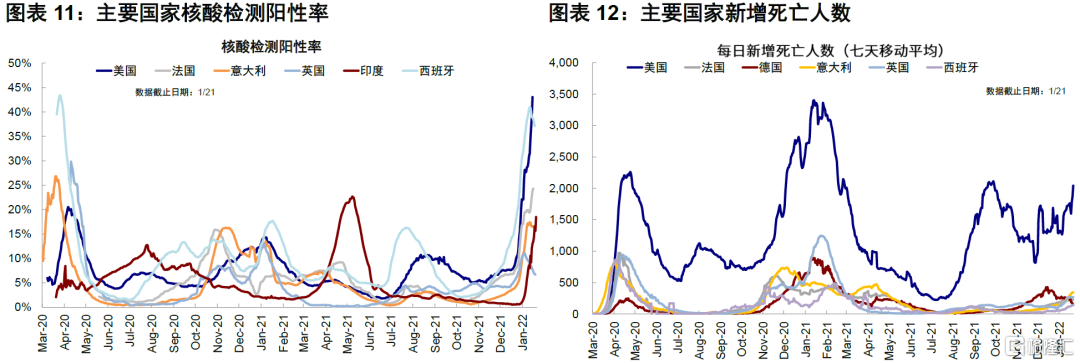 我们在《本轮Omicron对供需的影响线索》中指出,参照南非和英国的经验,Omicron疫情从激增到筑顶大概持续一个月左右,观察核酸检测阳性率的规律也基本一致。截止本周数据,美国、加拿大和意大利日均新增确诊病例均已经筑顶,参照此经验,欧洲其他国家可能2月初出现拐点。