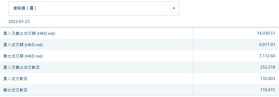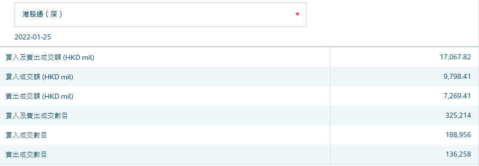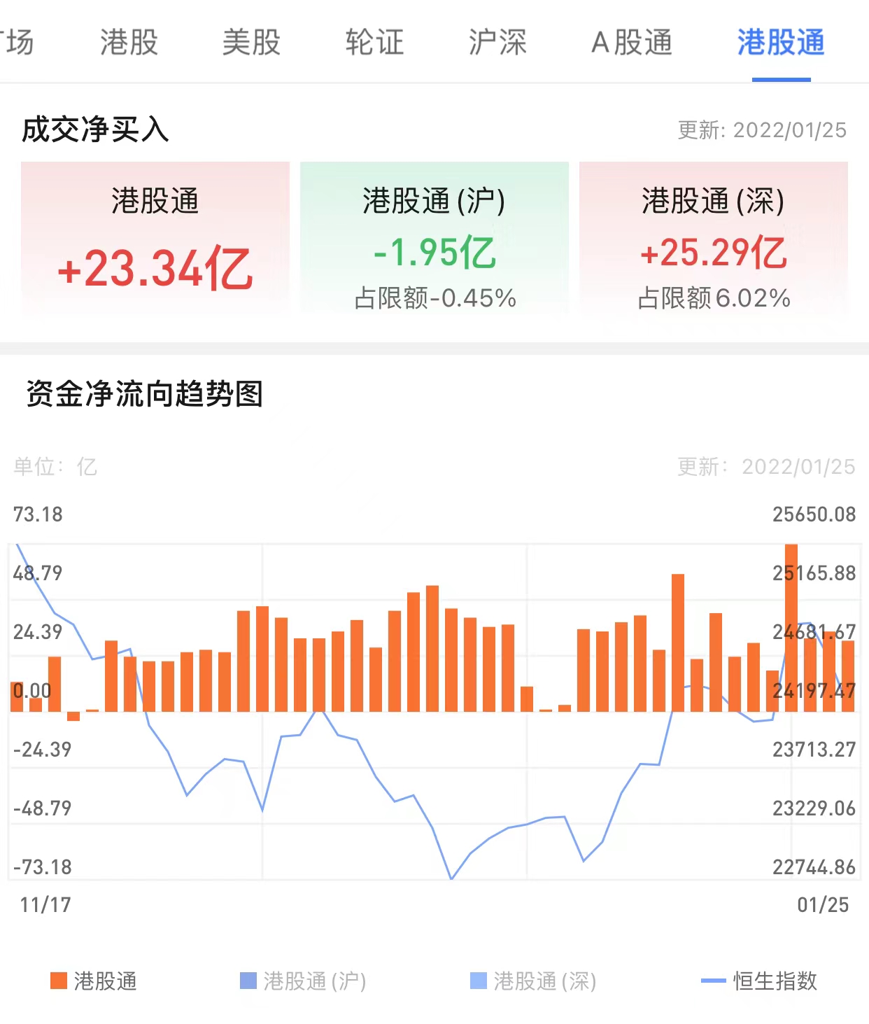 1月25日港股市场,北水成交净买入23.34亿,其中港股通(沪)成交净卖出1.95亿港元,港股通(深)成交净买入25.29亿港元。