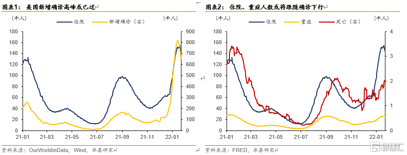 第一,基本面方面,短期关注重点将有所侧重:疫情=通胀=供应链>消费>就业。(1)疫情上,近期新增确诊已经开始回落,而住院、重症和死亡人数均有滞后性,后续关注其是否紧随确诊人数开启下行。(2)通胀上,一季度是供应链瓶颈改善重要的观察期,观测航运瓶颈的改善程度。(3)经济上,关注疫情拐点后,服务消费的高频数据是否快速修复。(4)就业上,短期重要性有所降低,预计一季度只要不出现显著不及预期的负增长,不会对首次加息的时点形成扰动。