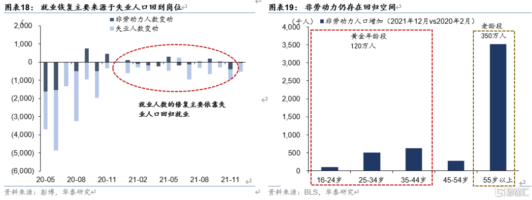 劳动力需求当前已经基本恢复到疫情前,但商品、地产相关劳动力需求可能不稳固。劳动力供给方面,目前失业人口回到岗位仍是就业改善的主要来源,但后续修复空间有限。非劳动力回到就业市场的节奏相对缓慢,后续存在改善空间但仍可能会有所滞后。总体看,新一轮疫情对就业市场存在有限扰动,但在通胀优先的政策导向下,不会对首次加息的时点形成太大的掣肘。