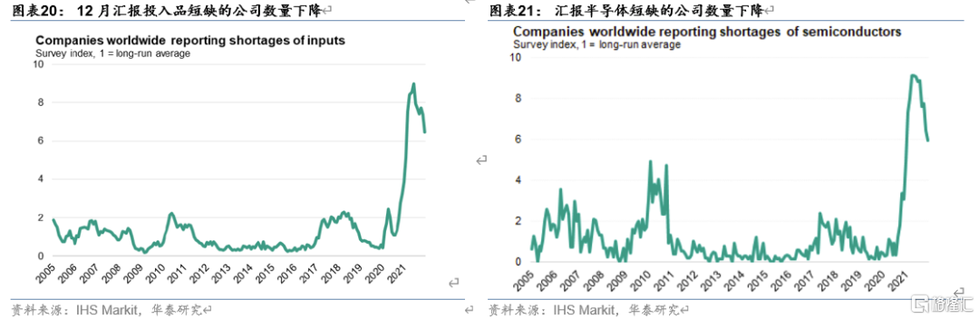 原材料短缺方面,已经有小幅缓解。据IHS Markit的调查数据,12月汇报投入品短缺的公司数量已降至去年2月份以来的最低水平,而汇报半导体短缺的公司数量降至去年1月份以来的最低值,说明原材料短缺在一定程度上有所缓解。