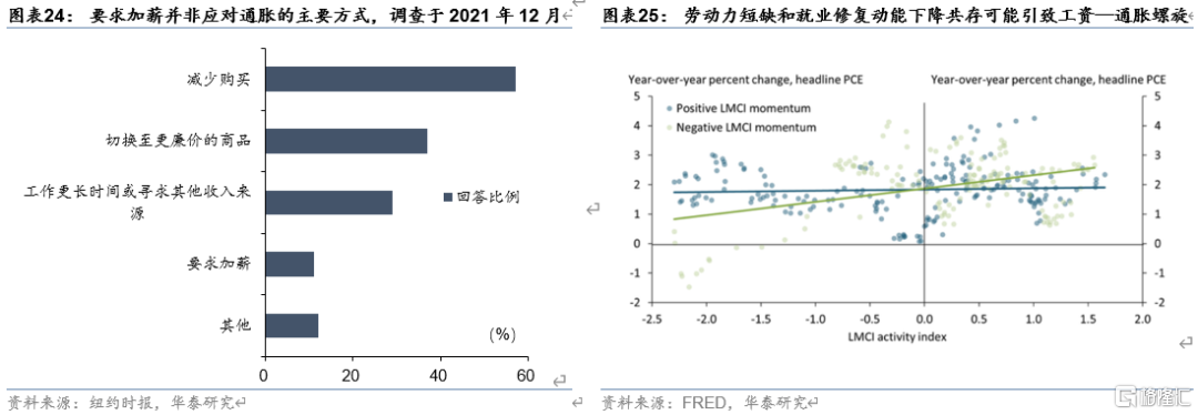 当前是否已经形成工资—通胀螺旋?我们认为暂时还没有,存在以下证据:(1)根据纽约时报和Momentive 2021年12月的调查数据,尽管有超过60%的调查对象对通胀表示担忧,但仅有11%的调查对象表示将通过要求加薪的方式应对通货膨胀;(2)根据堪萨斯联储的研究(Glover et al., 2021),当前通胀上升并非因为劳动力市场紧缺,只有当劳动力市场紧缺和就业修复动能下降同时发生时,才有更大的概率发生工资—通胀螺旋,当前的就业修复动能仍然不弱。(3)工资—通胀螺旋形成时,面对成本上涨,小企业缺乏向客户提高价格的议价能力,利润往往受到侵蚀,工资—通胀螺旋往往伴随着更多企业申请破产,当前并不存在这个问题。但如果后续通胀的持续时间超出预期,就业修复动能降低伴随劳动力短缺,可能加剧工资—通胀螺旋的形成,从而带来更大的通胀压力。