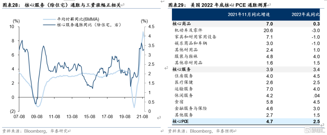 往前看,考虑到基数影响,我们预计美国通胀可能一季度见顶,随后开始回落,回落的方向相对明确,但回落的幅度存在较大的不确定性。在我们的基准假设之下,我们预计2022年底美国核心商品通胀将回落,但租金通胀和其他核心服务通胀仍有上升空间,综合影响之下2022年底核心PCE同比或仍在2.5%左右。
