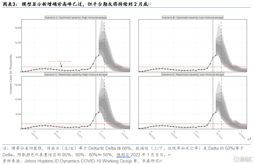 美国本轮疫情确诊高峰已过。截至1月22日,美国当日新增确诊7日移动平均已经连续10日下降,而包括Johns Hopkins在内多个研究机构模拟的结果显示,即使在最悲观的假设下新增确诊也将在本周缓和,这意味着本轮Omicron确诊高峰基本已经告一段落,但日新增确诊回落到Omicron疫情爆发前或仍需要两个月时间。