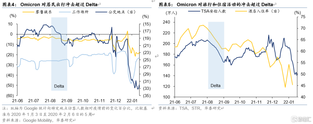 高频数据方面,O型毒株对服务业消费的负面影响大于Delta毒株,商品向服务的切换再次被滞后。参考Google Mobility分项活动数据、TSA安检人数和酒店入住率等高频数据,我们发现12月经济活动热度落入低谷。随着圣诞和新年假期结束,工作场所出行已经率先恢复,但其水平仍然低于Omicron爆发前。相比之下,零售销售的下降幅度相对最低,商品向服务的切换再次被滞后。