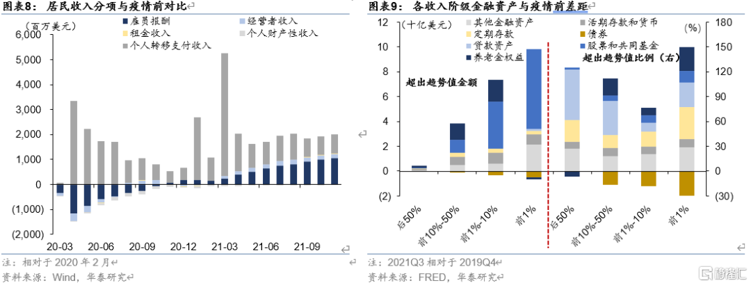 一是,收入和储蓄方面,伴随着失业率降低,居民部门薪资收入已经超出疫情前水平,且存在超额储蓄的支撑,收入和储蓄并非消费的掣肘因素,从比例来看,各收入阶层均有相似比例的超出趋势水平的流动性资产(活期和定期存款),仍能对后续服务消费的修复形成支撑。