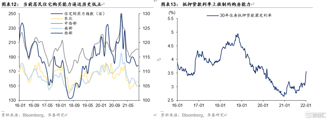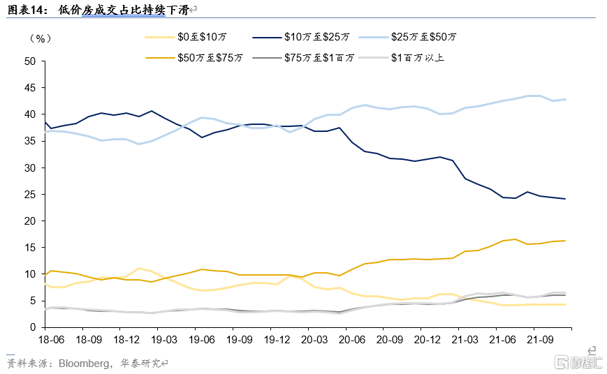 拖累因素在于,1)去年四季度以来的加息预期下居民抢先购房,房屋购买需求被提前透支;2)伴随着美联储加息,金融条件收紧、房贷利率上行,抑制居民购房需求;3)低价房源库存不足,房价上涨和小房型房源减少共同导致房价逐渐超出一般居民购房能力,使得当前成交房型主要为50万美元以上的房子,低库存或使得房屋成交被动下降。