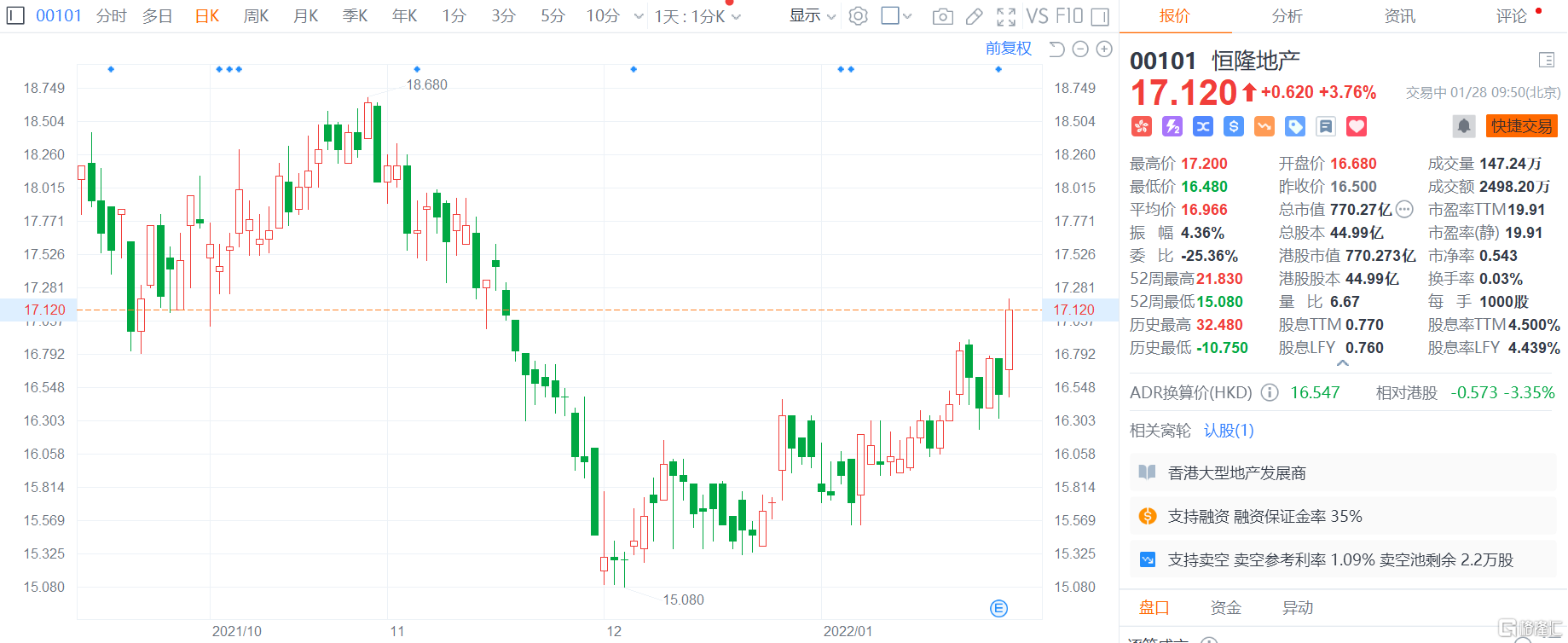 格隆汇1月28日丨恒隆地产(0101.HK)涨近4%,报17.12港元创逾两个月新高,总市值770亿港元,恒隆地产(00101.HK)公布2021年度全年业绩,2021年集团的总收入和营业溢利分别上升15%至103.21亿港元和上升14%至73.71亿港元。年内并无物业销售收入入账;股东应占基本纯利上升4%至43.65亿港元;每股基本盈利相应增加至0.97港元。董事会建议以现金方式派发2021年度末期股息,每股60港仙。