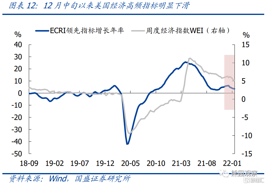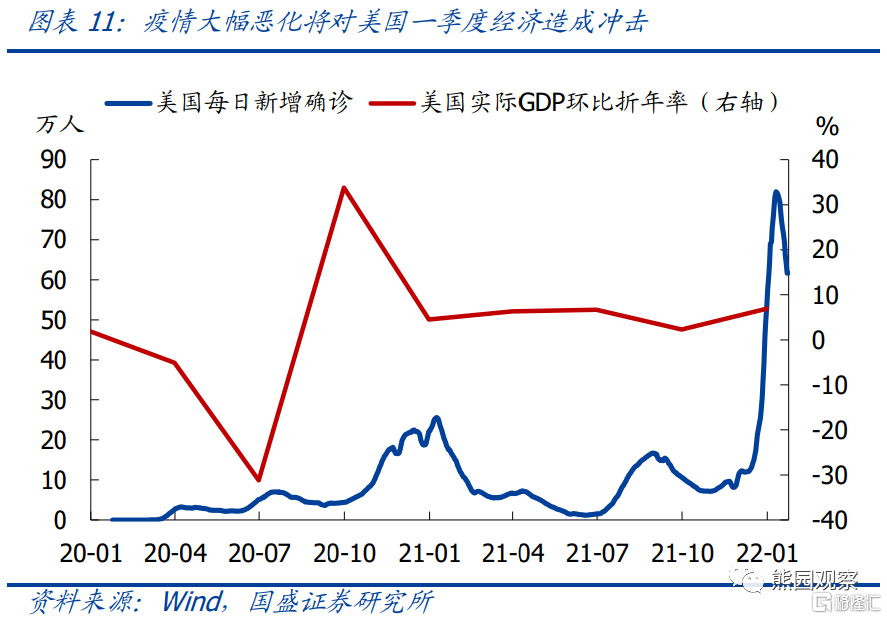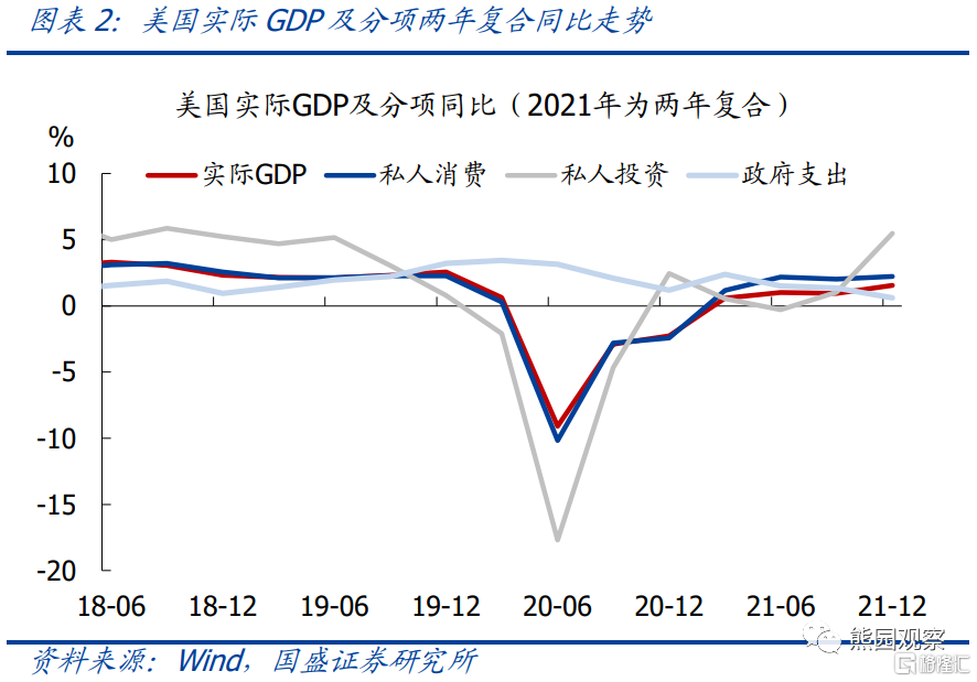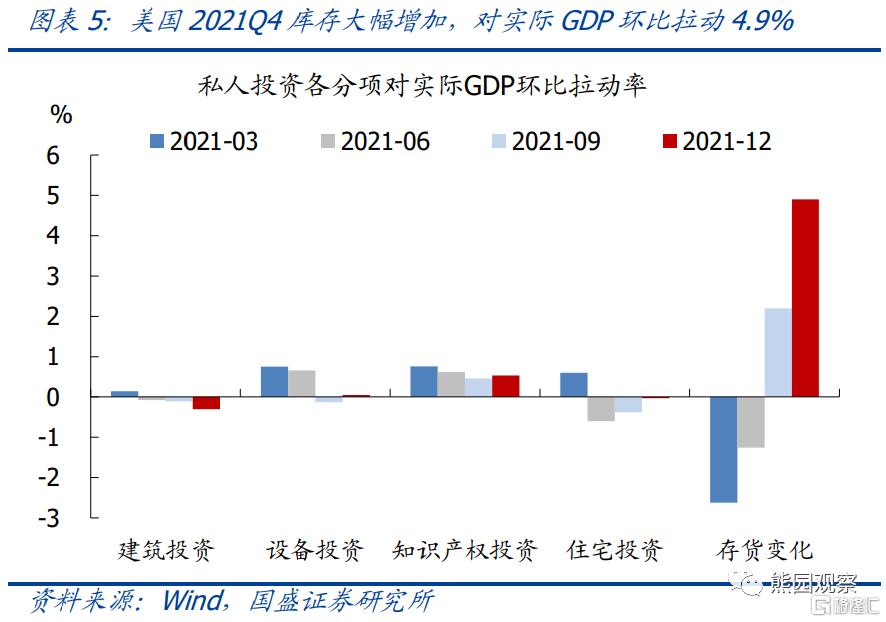 1、美国2021Q4实际GDP环比折年率回升至6.9%,除基数原因外,存货变动的拉动率为4.9%,是最大的贡献因素。存货大幅增加,主因Q3疫情恶化导致消费明显放缓,库存阶段性被动积累。以两年平均增速计,美国GDP同比已升至1.6%,接近2.0%的历史均值。