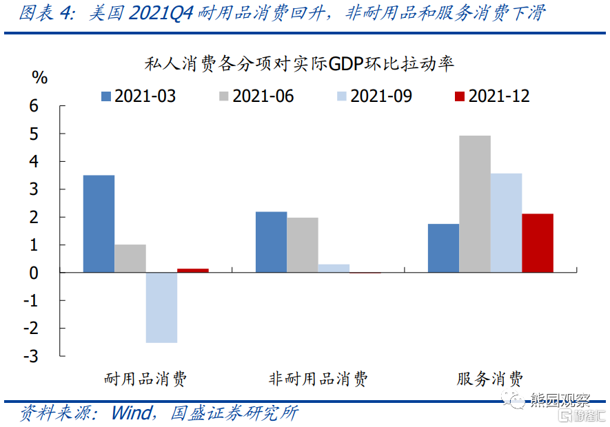 私人消费:Q4实际消费环比0.8%,高于前值0.5%;同比7.1%,与前值持平;对实际GDP环比拉动率为2.3个百分点,高于Q3的1.4个百分点。分项来看,耐用品消费对实际GDP的环比拉动率明显反弹,非耐用品和服务消费均有所回落。