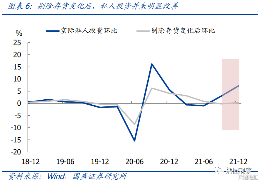 私人投资:Q4实际投资环比7.2%,高于前值3.0%;同比8.6%,高于前值7.1%;对实际GDP环比拉动率为5.2个百分点,高于Q3的2.1个百分点。分项来看,存货变化对实际GDP的环比拉动率高达4.9个百分点,其他分项合计仅拉动0.3个百分点。存货大幅增加,主因Q3疫情恶化导致消费明显放缓,库存阶段性被动积累。