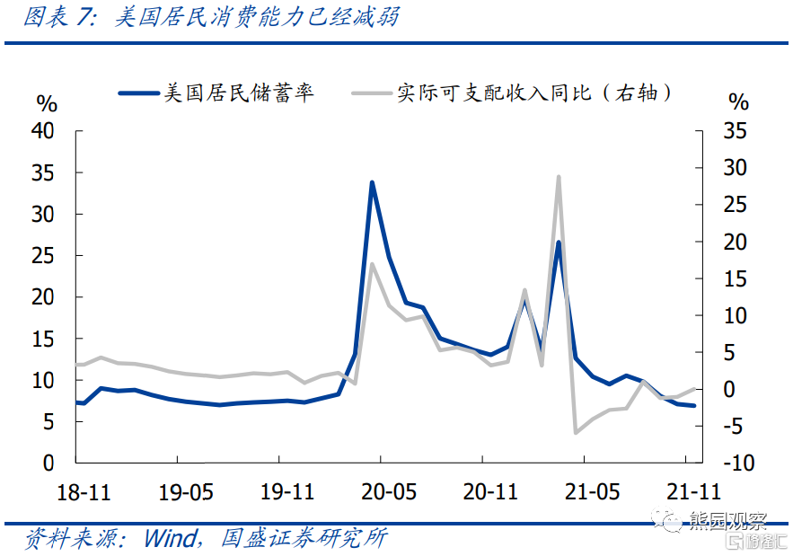 消费展望:前期报告《反转之年——2022年海外宏观展望》中我们曾指出,美国居民储蓄率已降至比疫情前更低,同时由于工资增速低于通胀,实际可支配收入增速持续为负,均反映出消费能力已开始减弱。服务消费虽有改善空间,但受疫情反复影响,修复速度十分缓慢。再考虑到财政补贴已经停止,后续消费增速大概率延续回落。