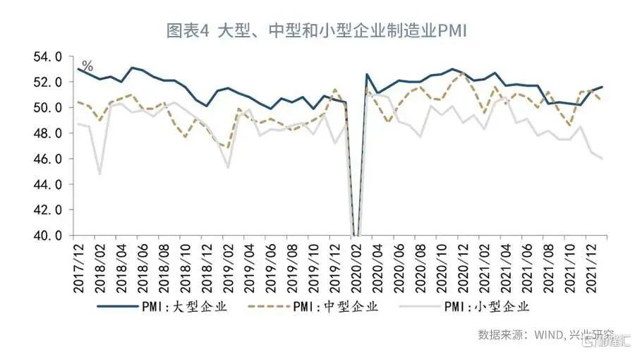 第一,春节返乡不及预期,平滑了生产下行幅度。从春运总客运量看,2022年春运客运量虽然高于2021年但仍远低于疫情前水平,参见图表3。2022年1月29日,国务院联防联控机制综合组对执行防疫政策再次提出“五个不得”明确要求,要求春节疫情防控科学精准,不得一刀切。这或折射,各地对外地返乡差异化疫情防控措施,返乡难依旧存在于部分疫情散点式爆发地区。尤其是近期北京、杭州两地疫情散点式爆发,加大了春节期间疫情防疫压力,春节返乡难以修复至疫情前水平。返乡人数的减少缓解了生产活动下行幅度,对春节期间的生产活动有所提振。具体分企业类型看:受春节返乡影响较小的大型企业制造业PMI反弹而中小企业回落,其中,大型企业较前月反弹0.3个百分点至51.6%,为2021年7月以来的最高值;而小型企业较前月回落0.5个百分点至46.0%,为2020年2月以来的最低值,参见图表5