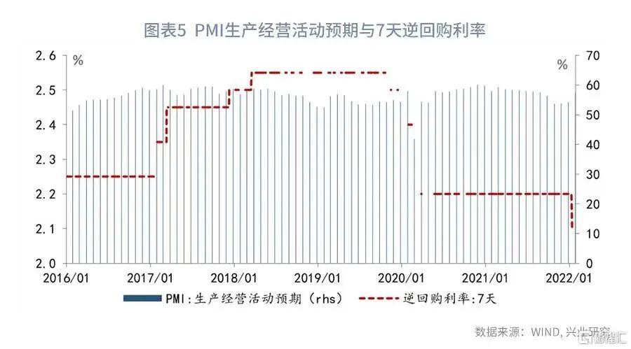 第一,在制造业方面,生产经营者活动预期显著抬升。进入到2021年第三季度,经济下行压力加大,企业生产经营预期不断走低,由2021年2月的59.2%连续下行至2021年10月的53.6%。然而,在稳增长信号不断释放的背景下,企业生产者经营预期正在修复。2022年1月17日,央行1年期MLF和公开市场操作利率下降10bp,2022年1月20 下调1年期LPR10bp和5年期LPR10bp,稳增长信号明确释放有效提振市场信心。数据显示,在降息的当月或次月,PMI生产经营活动预期均较前月抬升,参见图表6。