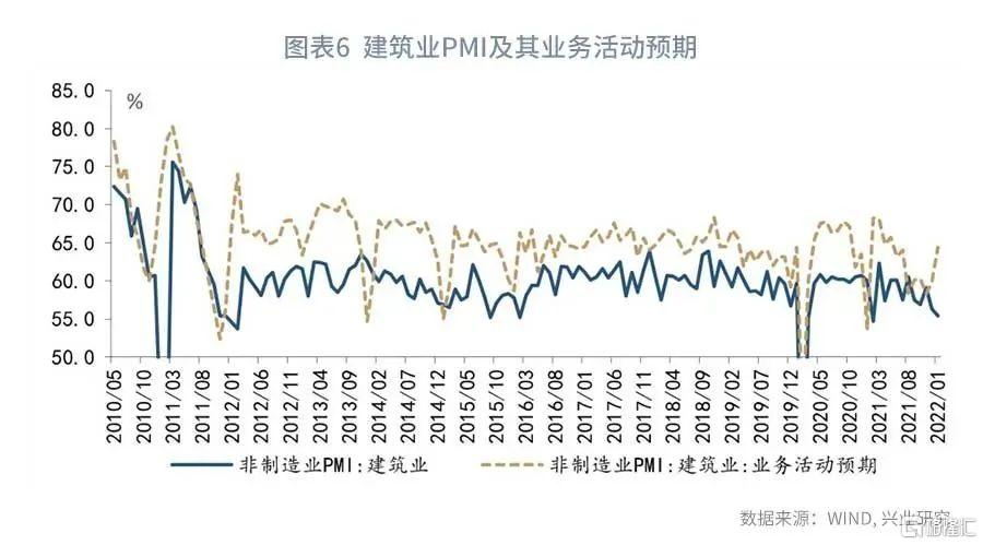 从预期看,2021年12月中央政治局会议明确释放稳增增长信号,随后1月17日公开市场操作利率下调、专项债发行提速、项目审批提速、房地产调控政策边际放松等,稳增长政策陆续落地,在此影响下,制造业生产者经营预期底部回升、建筑业PMI 新订单和经营者预期均上行,折射市场信心最为悲观的时刻已过,未来可期。