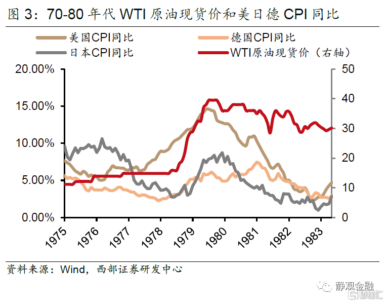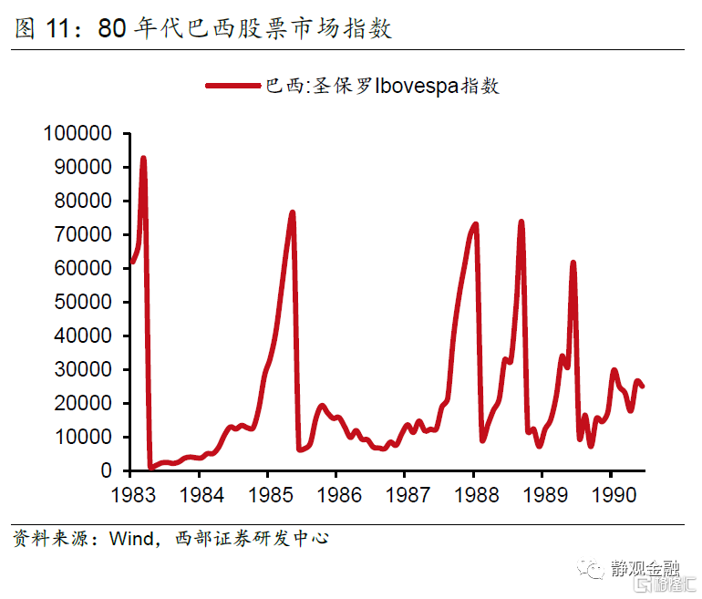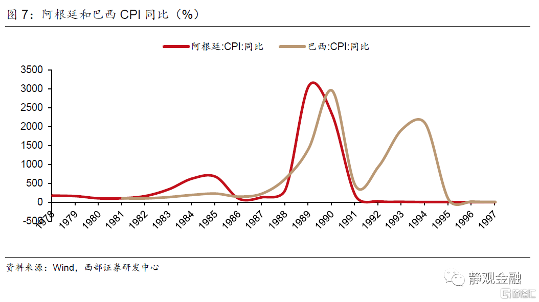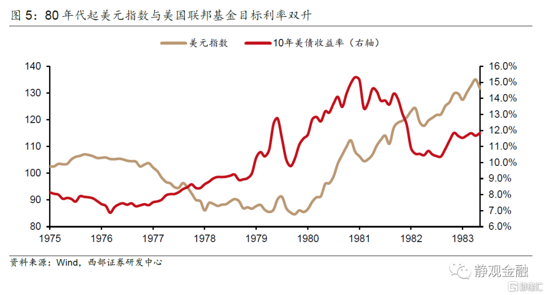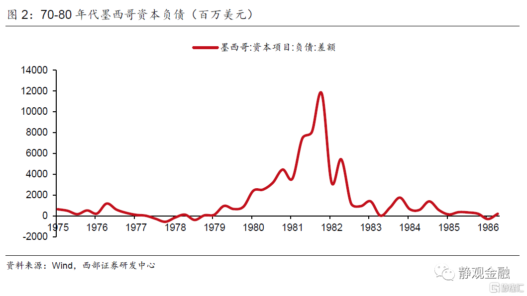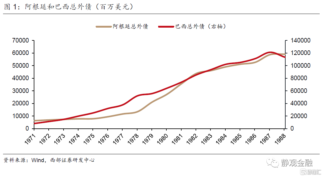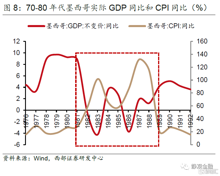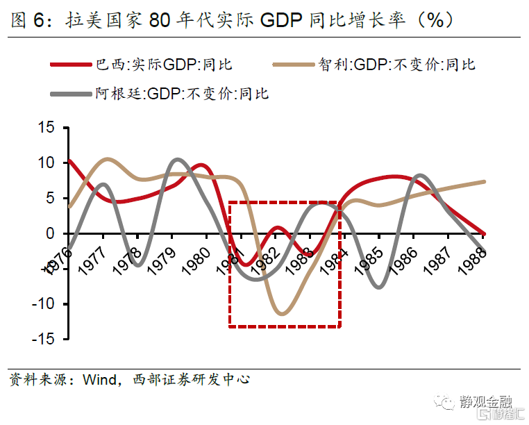 随着1979年伊朗革命触发第二次石油冲击,全球油价上升超过一倍,导致各国通货膨胀率高升。为了对抗通胀,各国央行开始收紧货币供给,以美国为首的发达国家的政策利率带动市场利率和本币价值同步大幅提升,带领全球经济进入典型的“紧货币、紧信用”阶段,同时也启动了拉美新兴经济体在80年代的严重衰退。