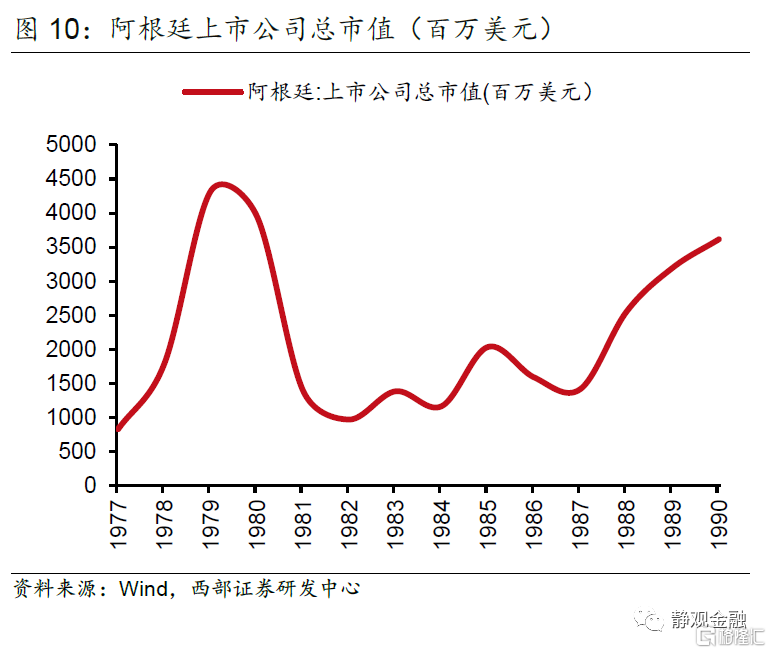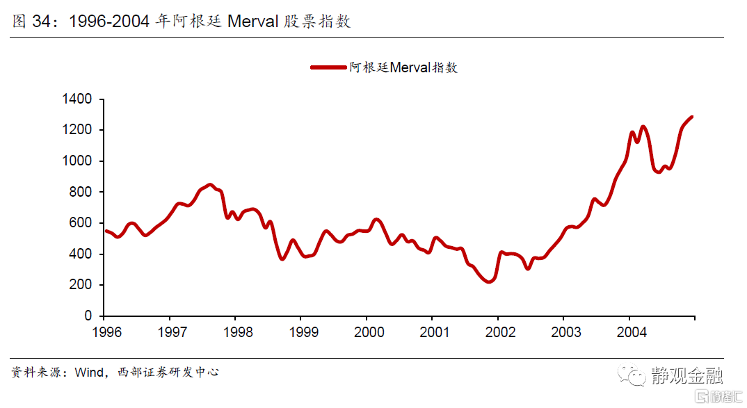 强势美元面前,阿根廷的主要贸易竞争对手巴西选择了将本币雷亚尔对美元贬值,阿根廷却只能按兵不动,这进一步加大了阿根廷在出口上的汇率劣势。最后,阿根廷在1999年进入了萧条期,政府在2001年停止偿付债务,并在2002年被迫将比索与美元解锚,导致了比索贬值超过70%,以及紧随其后的30%通货膨胀率。阿根廷的主要股票指数Merval表现出了较强的预警性,在1997年经济尚未出现疲态时就开始下行,并在2002年汇率解锚前达到低点,跌幅约70%。