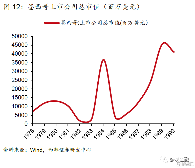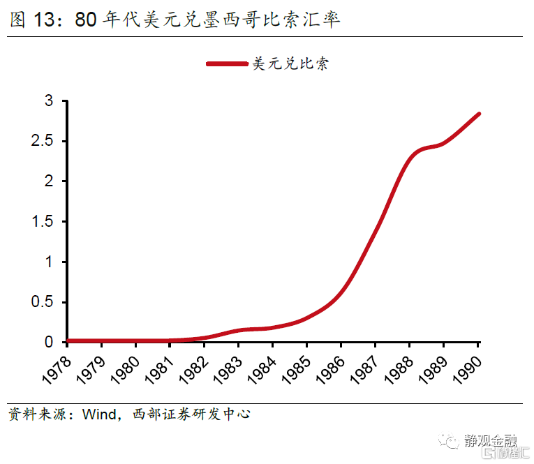 与阿根廷等国金融市场的动荡类似,墨西哥的上市公司从1980年开始的两年间同样损失了超过80%的市值,并在1984年前后经历了一轮“过山车”式起伏。通胀压力下,墨西哥比索在80年代同样对美元贬值了上百倍,从一种单位价值极高的货币变得和美元量级类似,直到单位价值被美元反超。