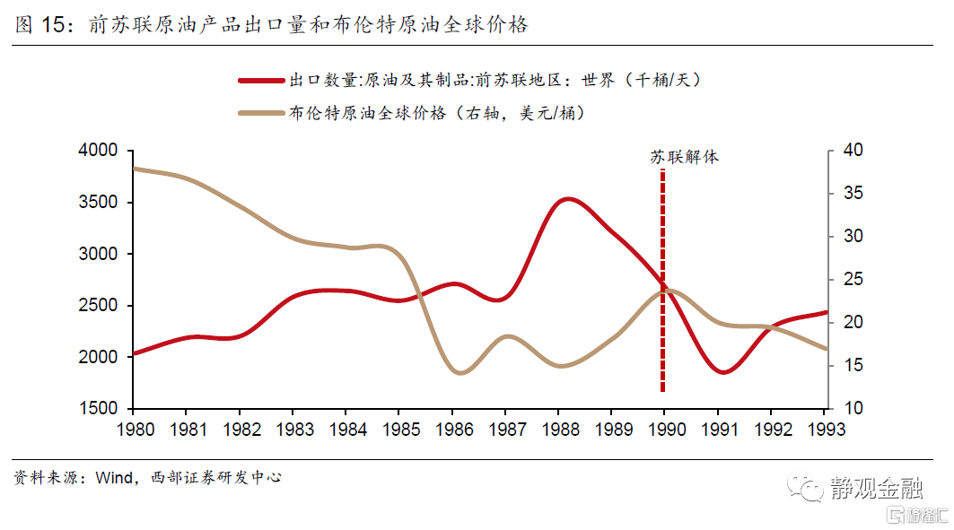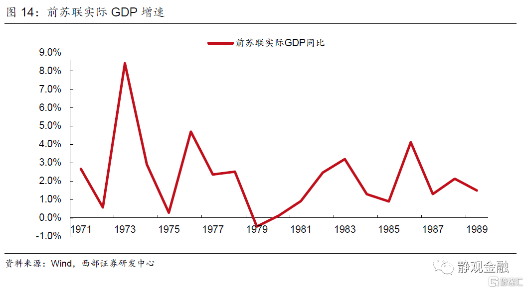1978年,前苏联南下并主导了阿富汗战争,旷日持久的战事令苏联经济陷入停滞。1979年前苏联GDP同比下滑0.47%,为1964年后首次。此间原本国际油价已经随美元强势而走低,1985年9月沙特又突然宣布将石油日产量从200万桶提高到1000万桶,以期提高市场份额,令原油价格加速暴跌至每桶10美元。虽然前苏联在资本方面相对封闭,没有出现债务和通胀但也存在产业单一、依赖资源出口的问题,终归受到了来自美元系统的冲击。全球扩张“野心”难敌内忧外患局势,1991年12月25日前苏联解体,冷战结束[2]。