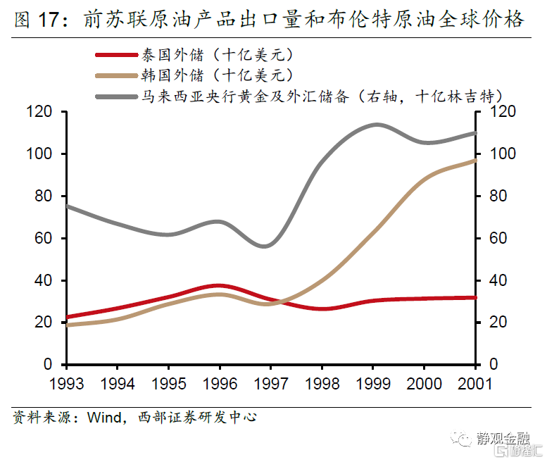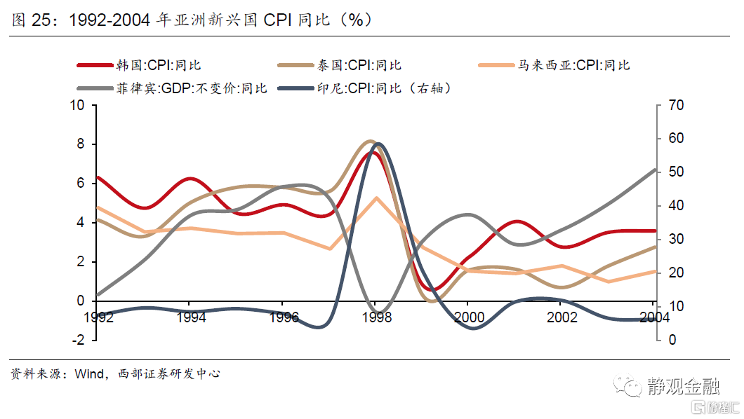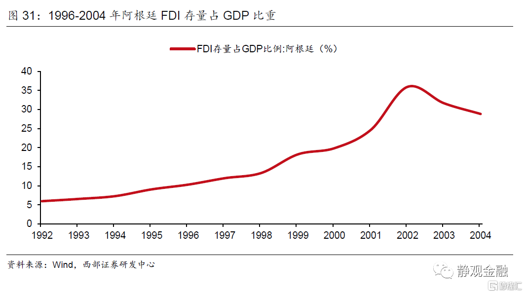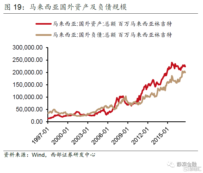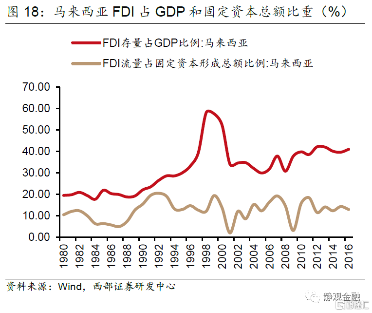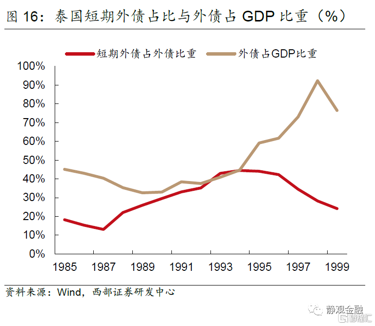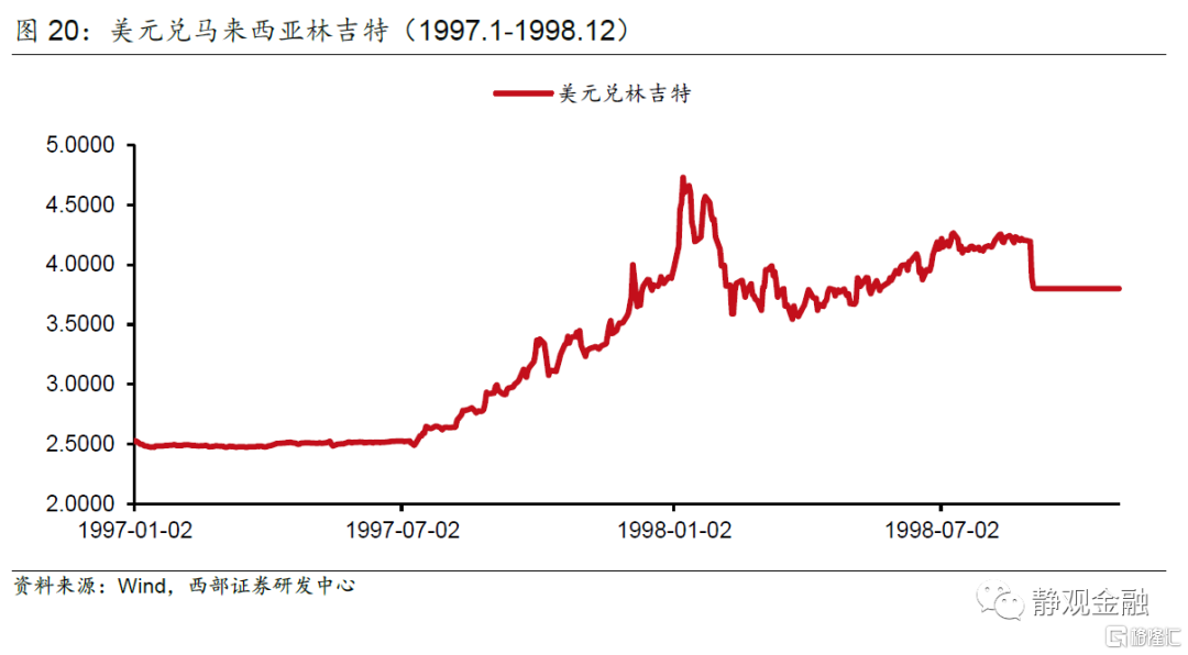 再以马来西亚为例。亚洲金融危机爆发前,马来西亚FDI存量占GDP比重已经高达33%,且国外资产规模远低于国外负债(净负债约占GDP比重80%),这表明一旦马来西亚汇率发生波动将对国家资产负债表结构产生较大冲击。1994年美联储启动加息周期,初期美元指数仍处于贬值状态,林吉特仍在升值,FDI仍净流入马来西亚。但1996年开始美元和美国利率水平均上升,在林吉特受到国际投资者狙击后,汇率贬值导致马来西亚对外负债规模(美元计价)相对GDP(林吉特计价)比重被显著放大;FDI存量(美元计价)占GDP(林吉特计价)比重大幅走高,1998年该指标曾超过60%。