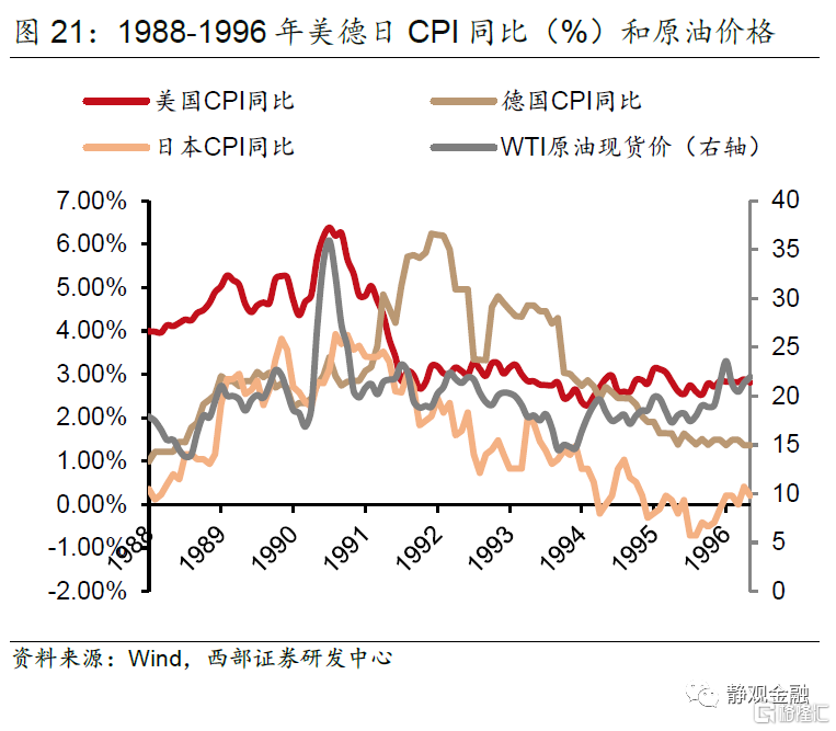 随着90年代初伊拉克入侵科威特导致的油价恐慌性飙升在美国的军事介入下平息,各大经济体的通货膨胀从高位逐渐恢复温和水平。随着美国经济的强劲和亚太地区经济的繁荣,世界原油的消费增长推动了原油价格的恢复,1994年尼日利亚原油工人罢工事件触发了新的一轮抬升周期。当1993年底美债长端收益率忽然开始上升时,美联储预判另一波高通胀威胁正在袭来,于是开启了又一轮加息周期,到1995年初已经将折现率上调至5.25%,并在之后5年里保持了至少4.5%的高位水平。该轮加息操作完成后,美元开始了一波幅度超过20%的长期走强,美元指数在1995-1998三年里从82的初始水平一路上升到了100以上。