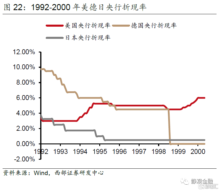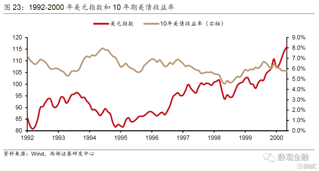值得注意的是,同期随着东西德统一导致的通胀问题逐渐得到化解,德国央行已经开始逐步降低政策利率,而泡沫破裂后的日本仍在实施降息刺激。美联储的这一轮加息与其他发达经济体的趋势相反,其结果是美国的货币政策和美元的强势在对东南亚金融危机的间接触发中扮演了决定性角色。