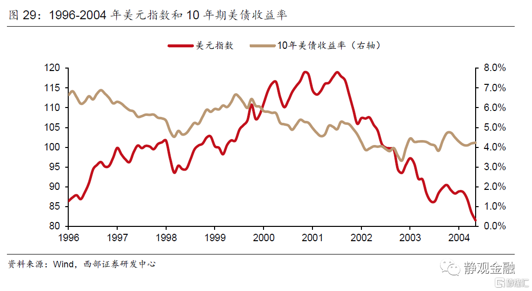 1995年开启的美元升值周期已经触发了东南亚金融危机,而随着美国经济在90年代后期不断升温,虽然通胀尚未出现明显攀升征兆,美联储还是在1999年再次决定“先制”加息,一年时间里将政策利率拉升了约1.5%,美元继而又迎来一波上行,一度逼近120点。