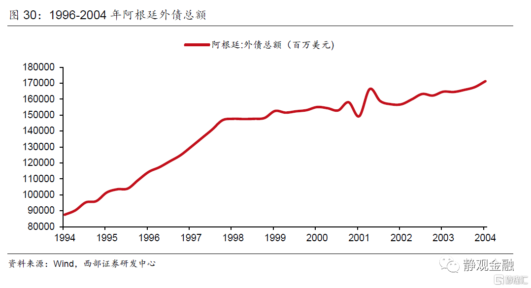 2001年的阿根廷货币危机本质上是80年代拉美危机的延续。为了对抗高通胀,阿根廷政府在1992年发行新比索时将其与美元锚定在1:1的水平上,这产生了三个效果:1)切实控制住了阿根廷的通货膨胀。2)极大地鼓励了外资向阿根廷国内的流入。3)限制了阿根廷对外贸易增长的能力。与美元的锚定虽然为阿根廷的经济带来了一时的繁荣,但在这十年里阿根廷的外债规模愈发庞大,并开始依赖于IMF的廉价融资,这都成为了导致危机爆发的潜在要素。
