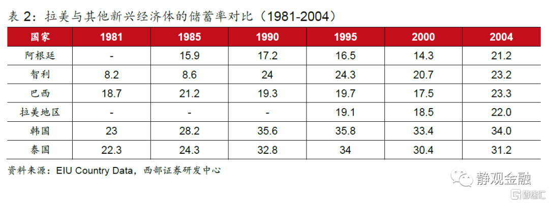 拉美经济体经济衰退,陷入了中等收入国家陷阱。1981年阿根廷和巴西实际GDP同比滑落5.69%和4.25%,次年智利以11%的跌速加入,巴西和智利的经济衰退持续到1984年,而阿根廷的经济在1986年一轮短暂的复苏后再次滑落,直到90年代初才开始恢复趋稳。同一时期,拉美国家的债务问题也触发了严重的通货膨胀危机,阿根廷和巴西在80年代的通胀率很少低于100%,而且在80年代末和90年代初更出现了高达3000%的通胀率,极大地威胁了货币系统的稳定性,同时也进一步恶化了储蓄率不足、经济依赖外部融资的问题,并在美元和美债收益率的同步走高下触发危机,陷入了类似的恶性循环。墨西哥亦从1981年开始经济彻底失速,陷入了长达7年的低增长和高通胀,期间通货膨胀率基本维持在50%以上,且曾两轮突破100%,实际GDP则在1983和1986年分别出现4.2%和3.75%的负增长;高通胀反过来也对储蓄率造成不利影响,进一步加重国民经济的外部依赖性,储蓄占GDP比例从1983年的24.99%跌落到1993年的15.64%。