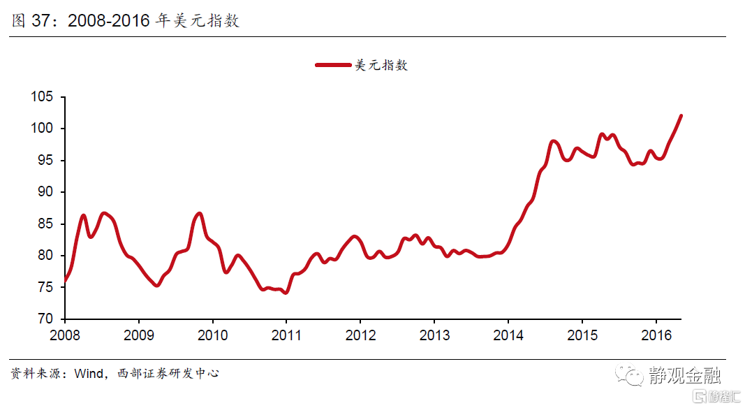 虽然在金融危机后美欧为首的各主要经济体都维持了宽松的货币政策,但自2011年起,美国页岩油开始规模化生产,技术不断进步,到2014年美国在全球原油市场份额已由2008年的7.6%提升至12.4%,这轮技术革命推动美元进入了上行周期。