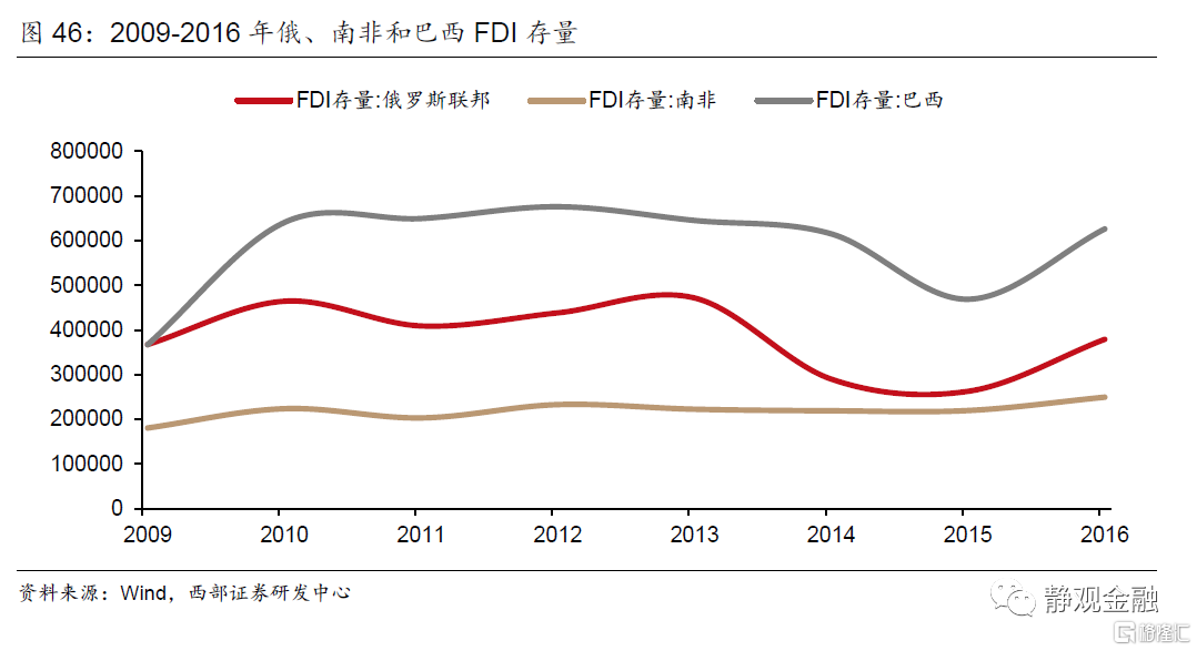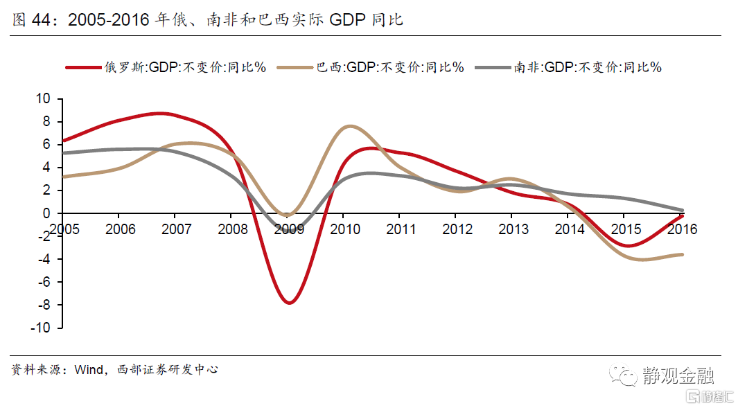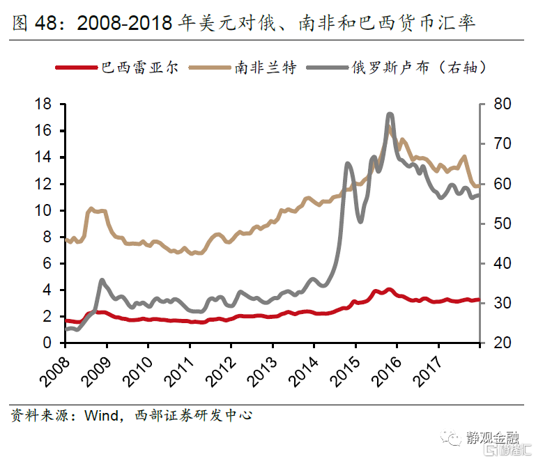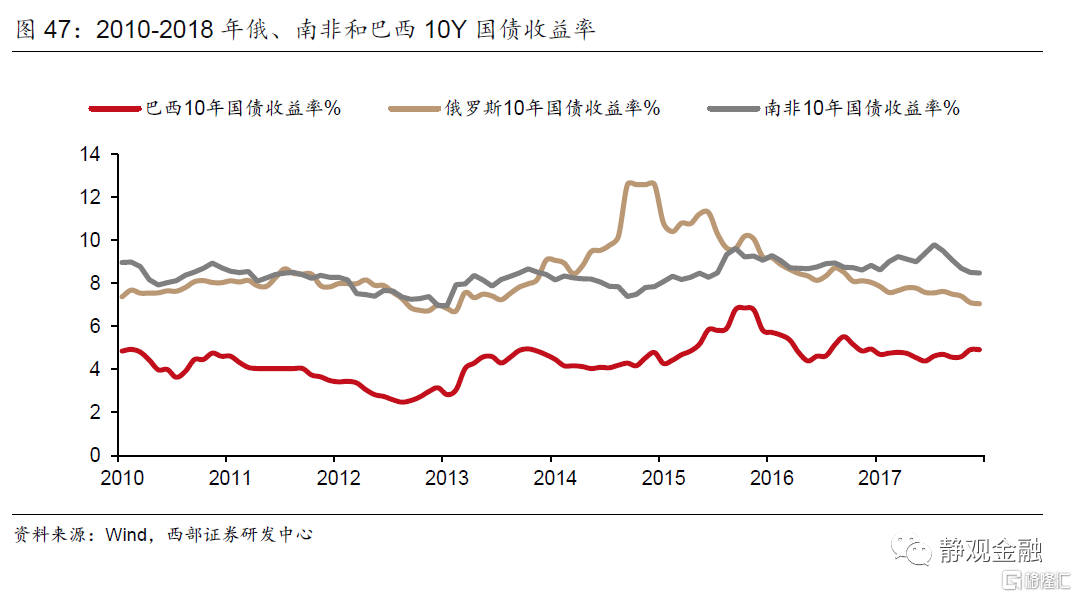 除了前文提及的俄罗斯以外,2014年开始的强美元背景下,伴随国际油价和其他大宗商品价格的下跌,巴西和南非也遭遇了经济失速。其中,俄罗斯和巴西两国衰退比较严重,出现实际GDP负增长,而随着同期美元仍不断升值,俄罗斯卢布贬值幅度达50%,进一步引发通胀高企和资本撤离,而名义股指在通胀下拉高,但没有实际意义。此外,三个国家同时出现国债收益率上升现象,其中南非还遭到评级机构主权信用降级。