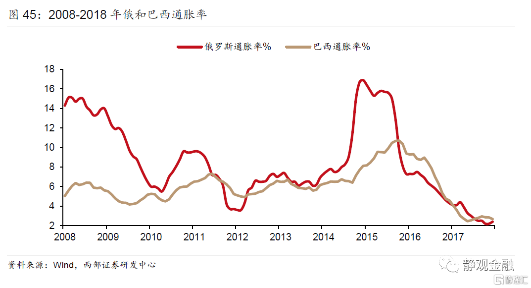 对于巴西、南非、俄罗斯等资源型新兴市场而言,美元升值意味着资源品内在隐含的美元价值下降,削弱资源国的全球竞争力,推动资源国汇率贬值。本币大幅贬值必然带来输入型通胀,因此强美元环境下,资源型国家往往出现高通胀甚至恶性通胀,经济处于滞胀期。企业盈利能力趋弱、国内融资成本却大幅攀升。弱美元周期则逻辑相反:资源品内在隐含的美元价值回升、资源国的全球竞争力增强带来企业盈利改善,汇率升值降低输入型通胀风险,内部融资成本相对回落。