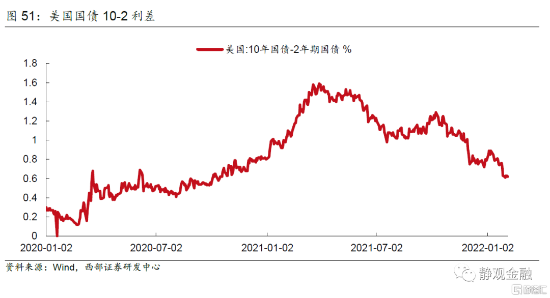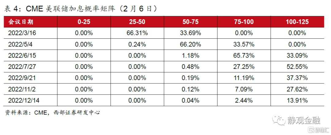 连续加息或导致年内美债曲线发生倒挂,年内3次加息或为大概率。正如我们在1月27日的报告《怎么看美联储能够实现的加息节奏?》中提到的,1月议息会议美联储传递的信号是3月加息,并在首次加息后开始讨论缩表,至少讨论一次的措辞表明美联储或将于6月启动缩表计划。假若以单次加息25BP为标准,2月4日2年期美债收益率站上1.3%或已隐含了美联储的4次加息。假若以CME为标准,今年加息3次的概率是最高的。也就是说,目前市场“感知”到的今年美联储加息次数为3-4次。同时,2月4日 10年与2年期美债收益率差值已经降至62BP,加上10年期美债收益率的不确定性,一旦年内美联储加息超过3次且暗示明年继续加息3次则年内美债曲线就有倒挂风险。因此,能否连续加息除了受通胀、就业等经济因素影响外,美联储可能还会考虑美债曲线。此外,正如我们在2月4日的报告《美国通胀拐点:早则Q1;迟则Q2》指出,美国通胀拐点大概率出现在H1,早则Q1、迟则Q2,进而H2美联储加息紧迫性料将有所缓和。目前看,3月加息、6月或有加息,Q3利用缩表代替更多次加息防止美债曲线倒挂,随后在中期选举后的12月再度加息的概率或最高。