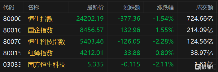格隆汇2月8日丨港股上午盘三大指数低开低走,大型科技股全挫,致恒生科技指数跌2.28%,恒指跌1.54%下挫377点。南下资金半日逆势净流入14.03亿港元,大市半日成交额为724亿港元。