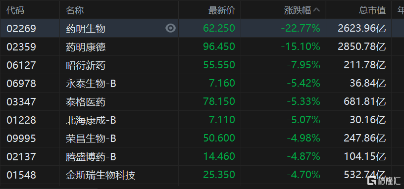 盘面上,药明系跌幅居市场首位,被美国商务部列入“未经核实名单(UVL)”,药明生物重挫近23%停牌,药明康德跌超15%,受此影响生物科技股多数走低,互联网医疗股、特斯拉概念股、汽车股、光伏股、苹果概念股等纷纷下跌;权重科技股美团跌4%,阿里巴巴跌3.48%,京东、小米跌近3%,腾讯跌1.6%。 另一方面,消费类股逆势大涨,食品、猪肉、香港零售股齐升,统一企业中国逆势涨超14%表现最佳,煤炭、钢铁板块走强。