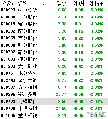 钢铁板块下跌,河钢资源跌超5%,马钢股份、宝钢股份跌超4%,南钢股份、首钢股份、鞍钢股份跌超3%。