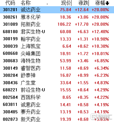 新冠治疗板块领涨,诚达药业、雅本化学、拓新药业20CM涨停,君实生物涨超12%,翰宇药业、上海凯宝、尖峰集团涨超10%,睿智医药、舒泰神涨超6%。