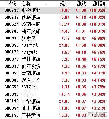 旅游股继续活跃,凯撒旅业、西藏旅游、岭南控股、曲江文旅涨停,张家界、ST西域、ST腾邦、桂林旅游涨超6%,丽江股份涨超5%,云南旅游涨超4%。