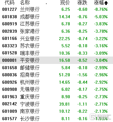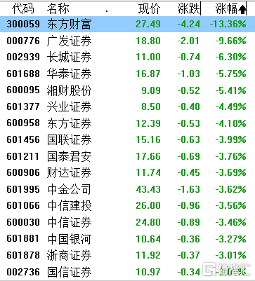 银行、证券板块跌幅居前,东方财富跌超13%,广发证券跌超9%,兰州银行跌超8%,长城证券跌超6%,华泰证券、湘财股份、成都银行跌超5%,兴业证券、东方证券跌超4%。