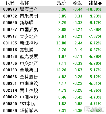 房地产股走弱,粤宏远A跌停,泰禾集团、新华联得超9%,荣安地产跌超7%,新城控股、嘉凯城跌超6%,蓝光发展、中交地产、金地集团跌超5%。