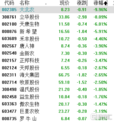 猪肉股大跌,大北农跌近10%,新希望跌近6%,正邦科技跌超3%,牧原股份跌超2%,温氏股份跌超1%。