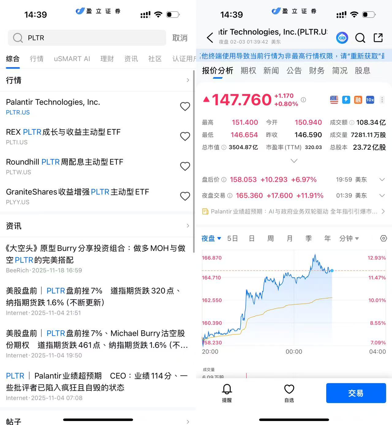 美东时间盘后,Palantir(PLTR)股价在发布2025年第四季度财报后,表现强劲,收盘上涨1.17美元,报147.76美元,涨幅0.80%。此前,该公司发布的财报超出市场预期,显示出强劲的增长势头。