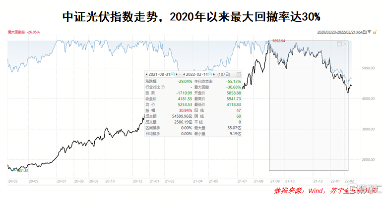 在“双碳”目标的制定下,光伏行业在近两年的时间内,成为资本市场上绝对的宠儿。以2020年3月疫情后的低点到2021年9月的最高点来看,代表光伏行业表现的中证光伏指数在一年半的时间内涨幅达215%。但随着2022年一批光伏产业的上市公司发布业绩预报,超过一半的上市公司业绩预亏,中证光伏指数也同样再次迎来一波较大幅度的回调,2020年以来的最大回撤率已达30%。