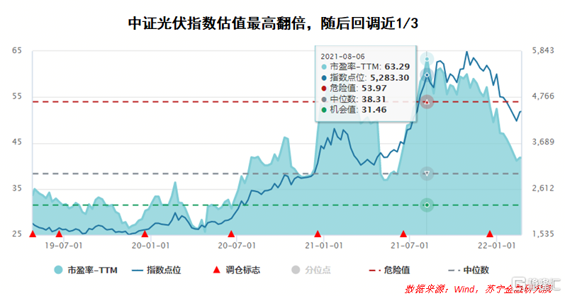 除了基本面之外,估值是另一个重要的影响因素。中证光伏指数自2019年4月发布至今,估值经历了较大的涨幅。指数在发布之初,整体PETTM约为32x,而在指数高点时,估值则超过了65x,估值翻了一倍还多。