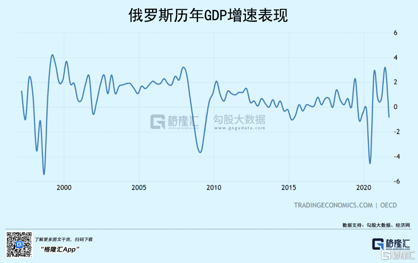 2014年,克里米亚战争爆发,俄罗斯遭欧美经济制裁,叠加原油大跌,经济增速急速萎缩至0.74%。2015年经济直接负增长1.97%。此后,再也没有3%以上的增长了。